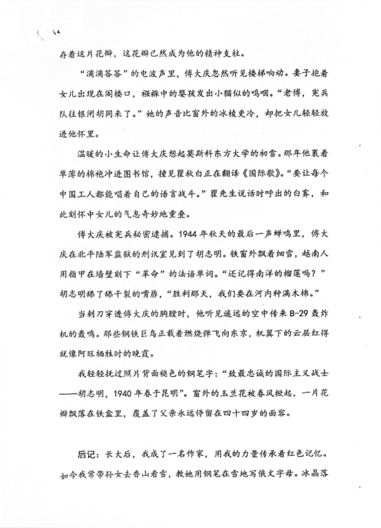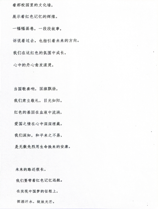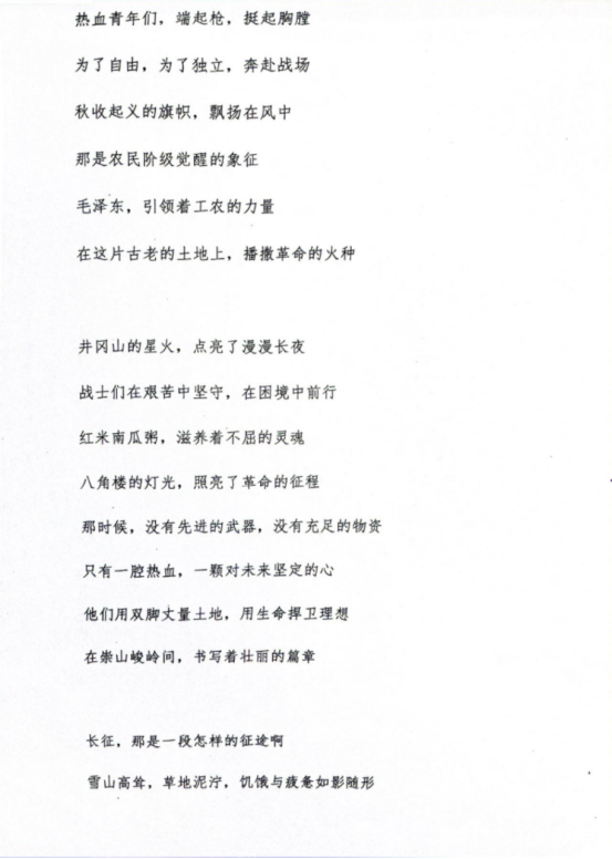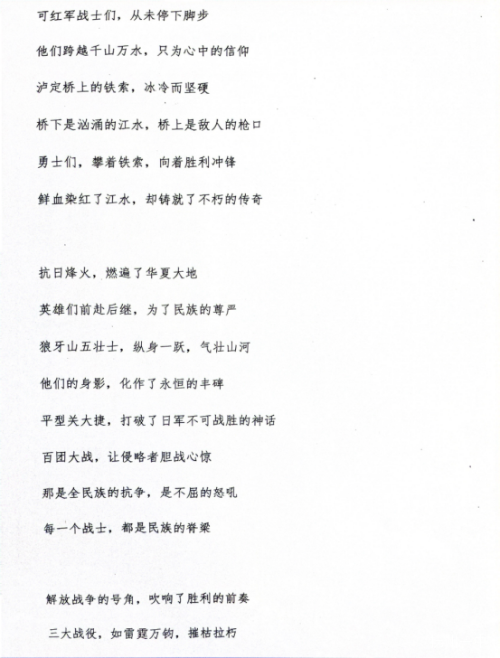 活动自启动之日起,便迅速点燃了师生们的参与热情。截至四月底,共征集到参赛作品60余篇。同学们纷纷以笔墨为媒介,抒发对革命英雄的崇敬之情,讴歌红色精神,展现家国情怀。有的作品深情追溯革命先烈的英雄事迹,有的通过生动的叙事展现了对红色精神的传承,还有的则以诗歌的形式,用凝练的笔墨传递着对革命先辈的无限追思......每一篇都蕴含着学生们对红色文化的深刻领悟和真挚情感。
