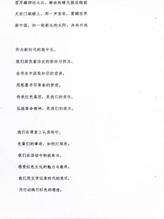 以文润心,以文化人。红色精神是中华民族砥砺前行的精神密码,更是青少年成长道路上不可或缺的精神滋养。此次活动的开展,不仅为广大学生搭建了一个展示才华的平台,更是一次深刻的精神洗礼,让同学们深刻领悟到红色精神的内核。相信每一位抚州一中学子都能将这份红色记忆融入血脉,以实际行动践行初心使命,在实现中华民族伟大复兴的征程中书写属于自己的青春华章。